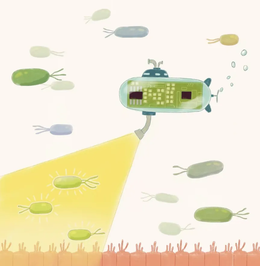 利用“半导体光遗传学”生物电子接口技术,构建“肠道工程菌电子胶囊”机器人,经口服进入肠道,用于相关疾病的特异性感知与干预,同时相关诊疗信息,通过无线网络与云端AI协同进行分析和决策。