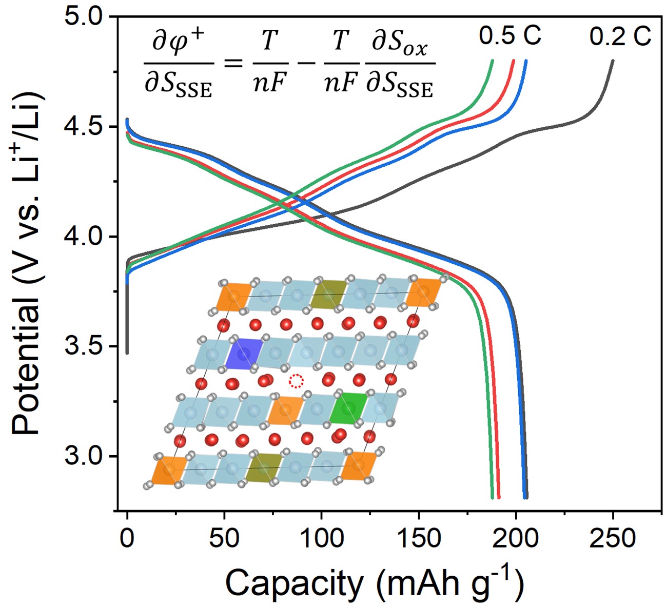 尽管氯化物SSE在高电压下表现出良好的稳定性(~4.3 V),但要与如NMC等高电压正极材料匹配,进一步提升其高电压稳定性(> 4.5 V)仍是挑战。常见的F掺杂虽然能够提高电解质的高电压稳定性,但由于F的高电负性,通常会降低离子电导率,导致ASSBs的电化学性能下降。近年来,高熵材料因其可调控的化学组成和独特的性能广泛应用于各个领域。在SSEs中引入高熵策略,通过化学无序和局部晶格畸变,能够有效提升离子电导率。据报道,高熵策略有助于抑制氯化物SSEs的氧化动力学,增强其与正极(LCO)的匹配性。然而,目前能够稳定至4.8 V的氯化物SSEs仍然稀缺,且在高电压下的循环寿命不足。开发兼具高电压稳定性和高离子电导率的SSEs,是实现高能量密度和长寿命ASSBs的关键。