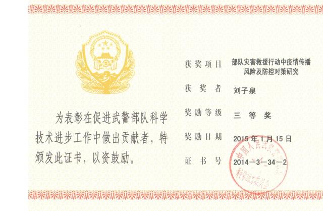 Title of Achievement:部队灾害救援行动中疫情传播风险及防控对策研究