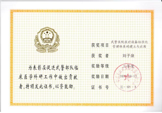 Title of Achievement:武警医院医疗设备标准化管理体系的建立与应用
