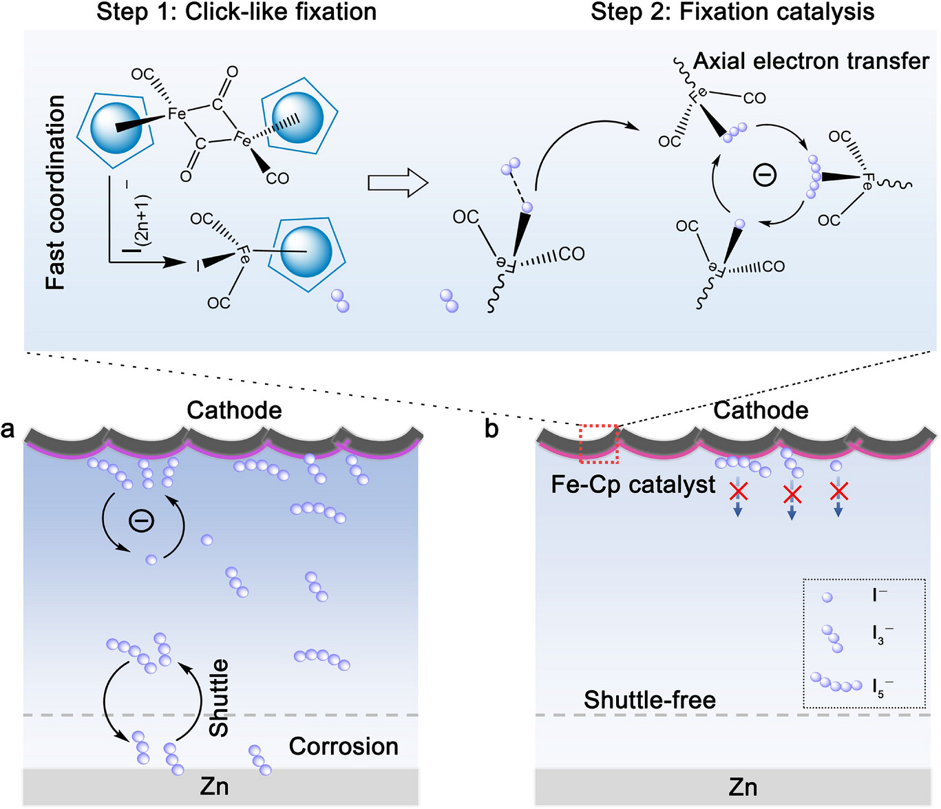 一、点击式锚定(Fixation):Fe–Cp与碘形成稳定的Fe–I配位键,牢固锚定多碘离子,显著抑制穿梭效应。