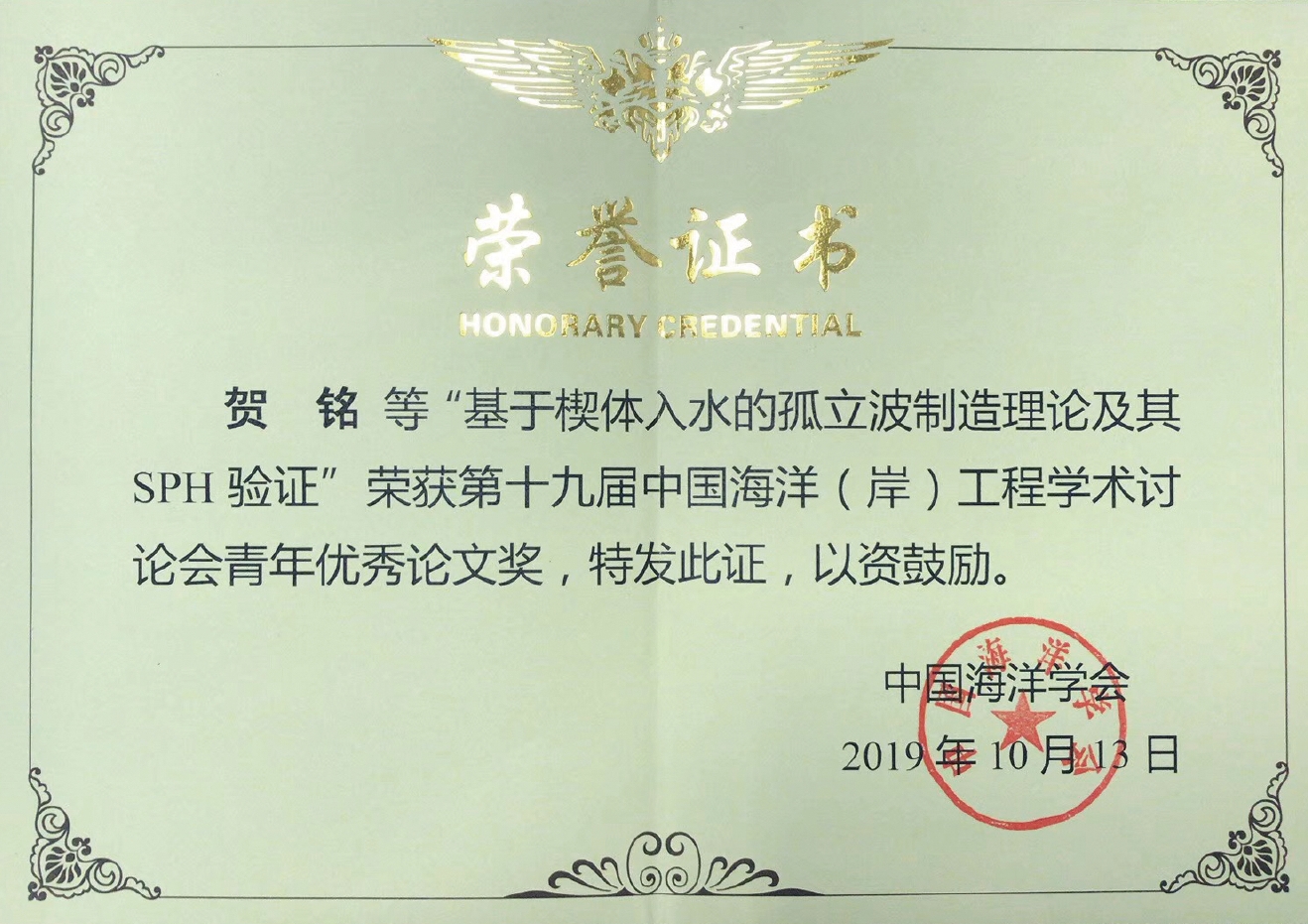 Excellent Paper Award for Young Researchers at the 19th Chinese Ocean and Coastal Engineering Academic Symposium, 2019.10