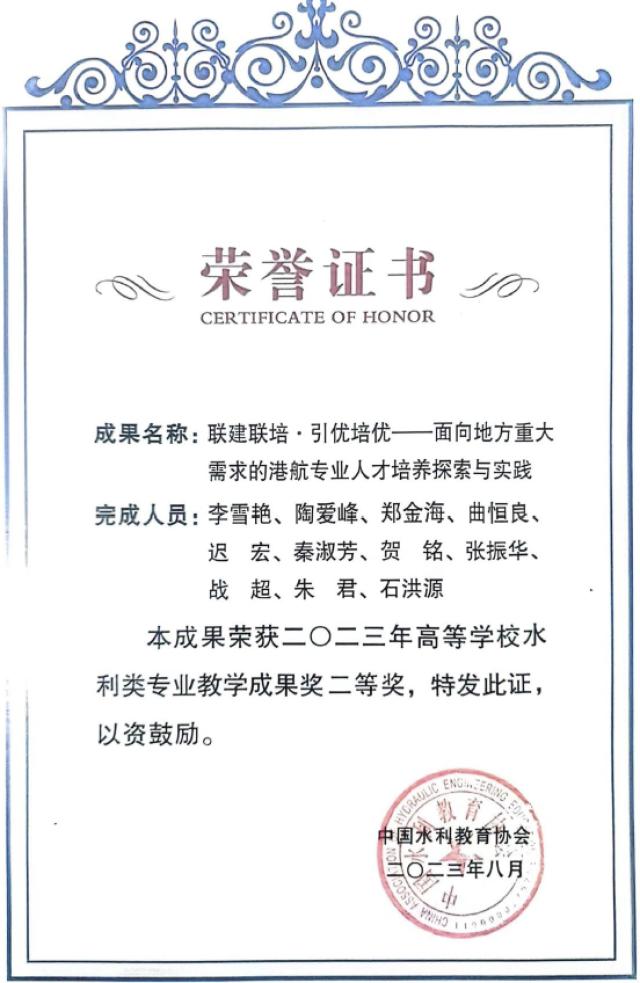 Second Prize of the 2023 Teaching Achievement Award in Hydraulic Engineering-related Majors of Higher Education Institutes, 2023.07