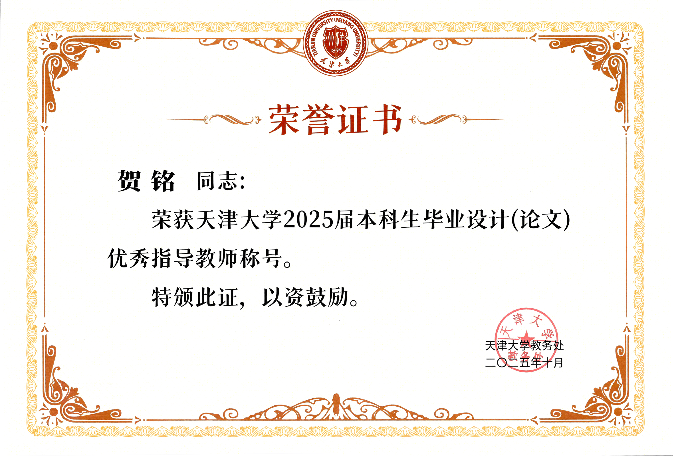 Outstanding Thesis Supervisor for the Class of 2025 Undergraduate Students, Tianjin University, 2025.10